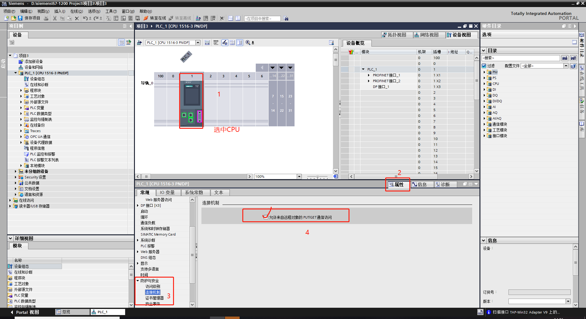 1.進入博圖,“常規-保護”,連接機制勾選“允許從遠程伙伴使用PUT/GET通信訪問”,重啟PLC。