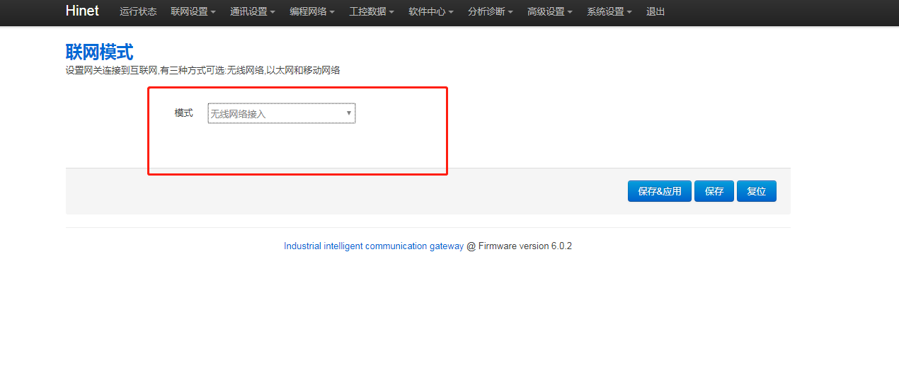 1. 網關后臺聯網模式是否正確,進網關后臺,點擊“聯網設置 - 聯網模式”,修改模式為“無線網絡接入”,再點擊【保存應用】,重啟網關生效。