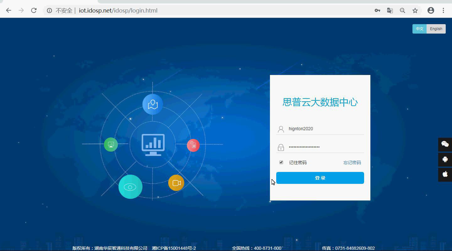 瀏覽器輸入iot.idosp.net 進(jìn)入思普云登錄界面,輸入賬號(hào)密碼進(jìn)入平臺(tái)管理界面。