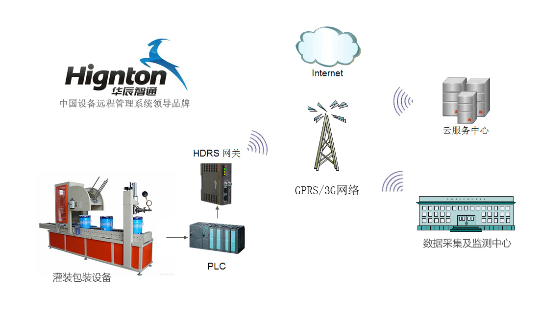 PLC遠程監控網關通過與灌裝包裝機械的核心控制器(如PLC等)連接,結合3G、WiFi、以太網及GPRS等通信方式并通過華辰智通專有的安全通道實現與服務器連接,實現設備的遠程監控及管理控制,并通過HDRS平臺強大的數據分析能力,分析來自控制器的各種數據,結合客戶自己設定的預警值實現對設備的故障預警及診斷功能,完成遠程的控制系統程序級的在線診斷、上下載和現場視頻查看、數據采集等多種功能,為設備提供分鐘級別的維護和診斷響應,并能夠依據客戶的要求提供運行的預警保障。