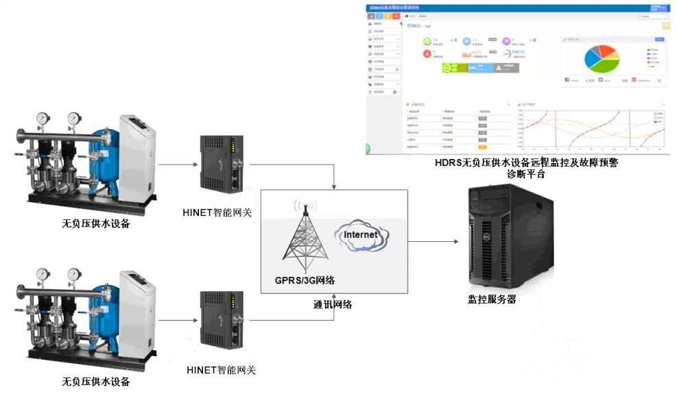 HDRS無負壓供水監(jiān)控預警系統(tǒng)由HINET智能網(wǎng)關、HDRS遠程通信密鑰及HDRS供水監(jiān)控預警平臺組成。HINET智能網(wǎng)關作為HDRS供水監(jiān)控預警系統(tǒng)的數(shù)據(jù)采集端與變頻控制器中的核心控制器(如PLC)連接,將采集到的數(shù)據(jù)通過GPRS/3G/以太網(wǎng)等方式上傳至監(jiān)控服務器中,并通過HDRS無負壓供水監(jiān)控預警平臺強大的數(shù)據(jù)處理能力實現(xiàn)對無負壓供水設備的壓力、倒流、過流、變頻故障等信息的實時監(jiān)測,同時實現(xiàn)超流量報警、進壓過壓報警等報警動作,并通過手機短信或郵件等方式通知設備管理員。